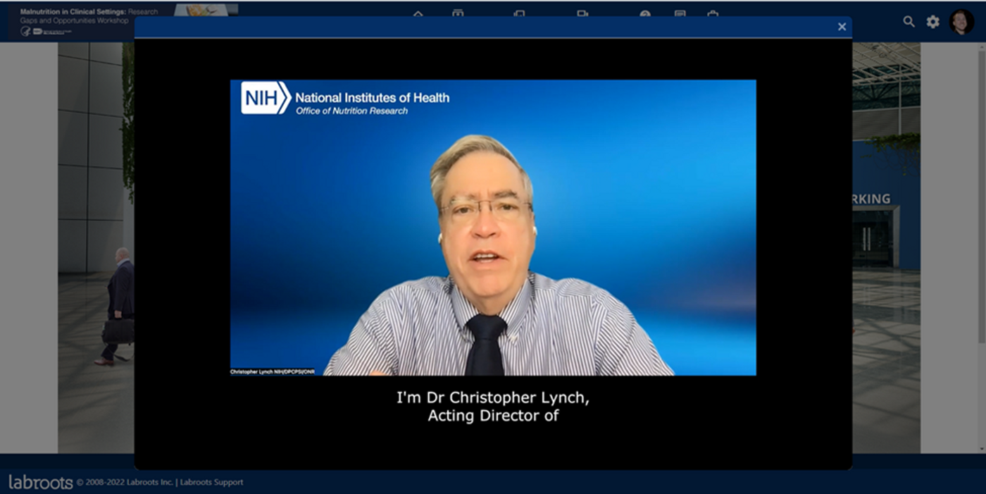 Figure 1. Example of embedded captions during the Welcome Video for “Malnutrition in Clinical Settings: Research Gaps and Opportunities Virtual Workshop.” (Credit: Labroots)