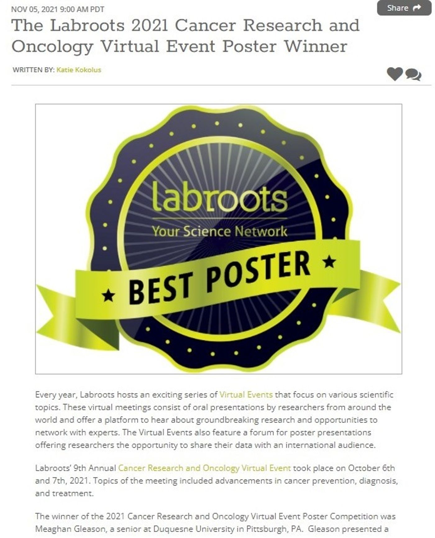 Poster Winner Article: Labroots 2021 Cancer Research & Oncology Virtual Event. Article written by Dr. Katie Kokolus