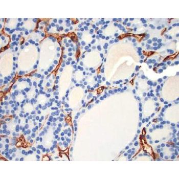 CD34, a single chain transmembrane glycoprotein, is selectively expressed on human lymphoid and myeloid hematopoietic progenitor cells. Staining for CD34 has been used to measure angiogenesis, which reportedly predicts tumor recurrence.
