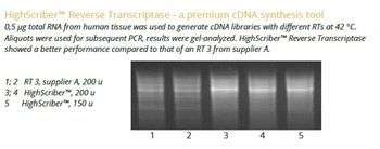 The HighScriber™ Reverse Transcriptase Mix is a premium tool for the high efficiency reverse transcription of up to 12-15 kb long cDNA. Mix includes HighScriber™ Reverse Transcriptase and Ribonuclease Inhibitor for save, robust cDNA synthesis and ease of use. HighScriber™ Reverse Transcriptase allows for high detection sensitivity from 1 pg of total RNA. The wide reaction temperature range (38°C - 55°C) ensures efficient cDNA synthesis from complex or GC rich templates.The enzyme uses ssRNA or ssDNA as a template, possesses no detectable Ribonuclease H activity specific to RNA in RNA-DNA hybrids. A highly reduced Ribonuclease H activity allows for transcription of full lengths long transcripts. HighScriber™ Reverse Transcriptase can be used for RACE as it has terminal transferase activity - adds cytosines to 3’ ends of cDNA.The Ribonuclease inhibitor premixed with the RT ensures RNA protection from ribonuclease degradation.Supplied 5X ALLin™ HighScriber Buffer includes everything you need for the cDNA synthesis reaction. To minimize pipetting steps it contains MgCl2, dNTPs, enhancers, stabilizers. The only things to add is the template RNA and primer./