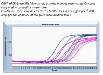 highQu qPCR master mixes are based on the small molecular inhibitor technology Hot Start PCR allowing to achieve highest sensitivity and specificity under both standard and fast qPCR cycling conditions. They provide excellent results on both AT and GC rich templates and guaranty rapid extension with early Ct values with minimum or no optimization.Our master mixes are supplied with PCR Water to guaranty the best performance. To suit the broad instrument range the ORA™ qPCR Green Master mixes are available in different versions –with low or high ROX concentration./