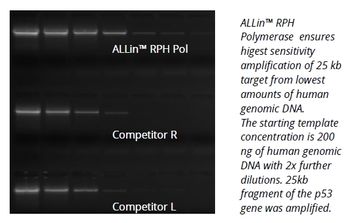 ALLin™ RPH Polymerase (Robust, Proofreading, Hot-start Polymerase) is the versatile engineered enzyme combining best polymerase properties for excellence in most demanding PCR applications, like low copy detection, long or high fidelity PCR, amplification of complex templates, crude sample PCR and multiplexing.ALLin™ RPH Polymerase has 5 times higher fidelity than Taq DNA Polymerase and produces A-tailed products suitable for ligating into TA cloning vectors.For the maximum convenience the ALLin™ RPH Mastermix, 2X is available./