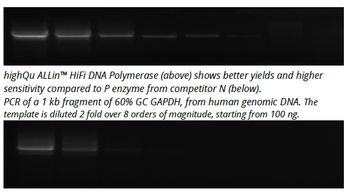 highQu dNTP sets and mixes meet all highest industry standards and allow for unrivaled performance of your PCR and other DNA synthesis, labeling or sequencing reactions.Produced under the stringent quality monitoring conditions, they guaranty reproducible results. More than 99% HPLC purity eliminates inhibitions of PCR and allows for increased yields with higher dNTP concentrations.Exceptional stability of dNTPs allows for short term ambient temperature shipments, short term room temperature storage or long PCR of more than 30 kb targets, as well as long amplifications exceeding 40 cycles./