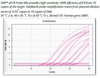 highQu qPCR master mixes are based on the small molecular inhibitor technology Hot Start PCR allowing to achieve highest sensitivity and specificity under both standard and fast qPCR cycling conditions. They provide excellent results on both AT and GC rich templates, in multiplexing and guaranty rapid extension with early Ct values with minimum or no optimization.Our master mixes are supplied with PCR Water to guaranty the best performance. To suit the broad instrument range the ORA™ qPCR Probe Master mixes are available in three versions – without ROX, with low or high ROX concentration./
