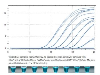 highQu qPCR master mixes are based on the small molecular inhibitor technology Hot Start PCR allowing to achieve highest sensitivity and specificity under both standard and fast qPCR cycling conditions. They provide excellent results on both AT and GC rich templates, in multiplexing and guaranty rapid extension with early Ct values with minimum or no optimization.ORA™ SEE qPCR mixes provide an additional advantage of a simplified tracking of the process, as they are colored with an inert blue dye to make samples much better visible during pipetting and handling.Our master mixes are supplied with PCR Water to guaranty the best performance. To suit the broad instrument range the ORA™ qPCR Probe Master mixes are available in three versions – without ROX, with low or high ROX concentration./