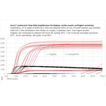 ALLin™ Isothermal 1Step RNA Amplification Kit enables detection of < 5 target RNA molecules in a short time of 30 minutes without the use of PCR cycler. An RT5 Mix, the blend of a thermostable reverse transcriptase and highly efficient RNase Inhibitor is included in the kit to initially synthesize cDNA from RNA templates.