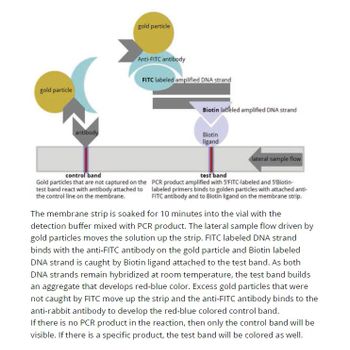 Principle: The membrane strip is soaked for 10 minutes into the vial with the detection buffer mixed with PCR product. The lateral sample flow driven by gold particles moves the solution up the strip. FITC labeled DNA strand binds with the anti-FITC antibody on the gold particle and Biotin labeled DNA strand is caught by Biotin ligand attached to the test band. As both DNA strands remain hybridized at room temperature, the test band builds an aggregate that develops red-blue color. Excess gold particles that were not caught by FITC move up the strip and the anti-FITC antibody binds to the anti-rabbit antibody to develop the red-blue colored control band.