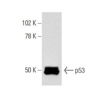 mouse monoclonal IgG1; p53 Antibody (Pab 246) is an IgG1 κ mouse monoclonal p53 antibody (also designated p53 antibody or TP53 antibody) that detects p53 of mouse and rat origin by WB, IP and IF. p53 Antibody (Pab 246) is available as the non-conjugated anti-p53 antibody form, as well as multiple conjugated forms of anti-p53 antibody, including agarose, HRP, PE, FITC and multiple Alexa Fluor® conjugates. p53, a DNA-binding, oligomerization domain- and transcription activation domain-containing tumor suppressor, upregulates growth arrest and apoptosis-related genes in response to stress signals, thereby influencing programmed cell death, cell differentiation, and cell cycle control mechanisms. p53 localizes to the nucleus, yet can be chaperoned to the cytoplasm by the negative regulator, MDM2. MDM2 is an E3 ubiquitin ligase that is upregulated in the presence of active p53, where it poly-ubiquitinates p53 for proteasome targeting. p53 fluctuates between latent and active DNA-binding conformations and is differentially activated through posttranslational modifications, including phosphorylation and acetylation. Mutations in the DNA-binding domain (DBD) of p53, amino acids 110-286, can compromise energetically-favorable association with cis elements and are implicated in several human cancers.