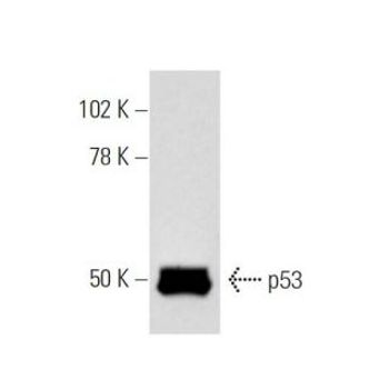 mouse monoclonal IgG1; p53 Antibody (Pab 246) is an IgG1 κ mouse monoclonal p53 antibody (also designated p53 antibody or TP53 antibody) that detects p53 of mouse and rat origin by WB, IP and IF. p53 Antibody (Pab 246) is available as the non-conjugated anti-p53 antibody form, as well as multiple conjugated forms of anti-p53 antibody, including agarose, HRP, PE, FITC and multiple Alexa Fluor® conjugates. p53, a DNA-binding, oligomerization domain- and transcription activation domain-containing tumor suppressor, upregulates growth arrest and apoptosis-related genes in response to stress signals, thereby influencing programmed cell death, cell differentiation, and cell cycle control mechanisms. p53 localizes to the nucleus, yet can be chaperoned to the cytoplasm by the negative regulator, MDM2. MDM2 is an E3 ubiquitin ligase that is upregulated in the presence of active p53, where it poly-ubiquitinates p53 for proteasome targeting. p53 fluctuates between latent and active DNA-binding conformations and is differentially activated through posttranslational modifications, including phosphorylation and acetylation. Mutations in the DNA-binding domain (DBD) of p53, amino acids 110-286, can compromise energetically-favorable association with cis elements and are implicated in several human cancers.