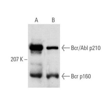 mouse monoclonal IgG1; Bcr Antibody (G6) is an IgG1 κ mouse monoclonal Bcr antibody that detects Bcr/Abl p190 and Bcr/Abl p210 fusion proteins of mouse, rat and human origin by WB, IP, IF and IHC(P). Bcr Antibody (G6) is available as the non-conjugated anti-Bcr antibody form, as well as multiple conjugated forms of anti-Bcr antibody, including agarose, HRP, PE, FITC and multiple Alexa Fluor® conjugates. The Bcr gene, mapping on chromosome 22, was initially identified on the basis of its fusion with the c-Abl proto-oncogene on chromosome 9 resulting in the generation of the Philadelphia chromosome in 90-95% of patients with chronic myelogenous leukemia (CML). The Bcr gene encodes for the Breakpoint cluster region protein (Bcr). A consequence of this translocation is the generation of a Bcr/c-Abl mRNA encoding an activated c-Abl protein kinase. The Bcr gene has been shown to encode a GTPase-activating protein (GAP) specific for the Ras-related GTP-binding protein, Rac 1 p21. While it has been speculated that the Bcr protein may also stimulate Rac 2 p21 GTPase activity, it has no effect on Ras p21 or Rho p21 GTPases. It is of interest that the GAP domain of Bcr maps outside of the region that remains on chromosome 22 (Philadelphia chromosome) in CML.