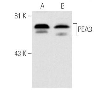 mouse monoclonal IgG1; PEA3 Antibody (16) is an IgG1 κ mouse monoclonal PEA3 antibody that detects PEA3 p60 of mouse, rat and human origin by WB, IP and IF. PEA3 Antibody (16) is available as the non-conjugated anti-PEA3 antibody form, as well as multiple conjugated forms of anti-PEA3 antibody, including agarose, HRP, PE, FITC and multiple Alexa Fluor® conjugates. Several members of the Ets gene family are known to encode sequence-specific DNA binding proteins. These include mouse PU.1, mouse and human Ets-1, Drosophila E74, chicken and human Ets-2 and rat GABP-a. Each of these proteins recognizes similar motifs in DNA that share a centrally located 5′-GGAA-3′ element. For instance, PEA3 binds the motif 5′-AGGAAG-3′ (the PEA-3 motif), but does not bind to the sequence 5′-AGGAAC-3′, recognized by PU.1, although PU.1 binds equally well to both sequences. It appears that all of the Ets proteins recognize the same central core sequence but that each protein interacts with unique sequences that flank this core. PEA3 is expressed at readily detectable levels in cells of epithelial and fibroblastic origin but is not expressed in hematopoietic cells. This is in contrast to other members of the Ets gene family, such as Ets-1, Ets-2 and Fli-1, each of which is expressed primarily in cells of hematopoietic origin.