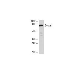 mouse monoclonal IgG2a; Syk Antibody (4D10) is an IgG2a κ mouse monoclonal Syk antibody (also designated spleen tyrosine kinase antibody or p72-Syk antibody) that detects the Syk protein of mouse, rat and human origin by WB, IP, IF, IHC(P) and FCM. Syk Antibody (4D10) is available as both the non-conjugated anti-Syk antibody form, as well as multiple conjugated forms of anti-Syk antibody, including agarose, HRP, PE, FITC and multiple Alexa Fluor® conjugates. Syk (spleen tyrosine kinase) is a 635 amino acid protein that contains one protein kinase domain and two SH2 domains. One of several members of the protein kinase superfamily, Syk functions as a positive effector of B cell antigen receptor (CD79)-stimulated responses, coupling CD79 with the movement of one calcium ion through one of two phospho-regulated pathways. Specifically, calcium ions travel through either a phosphoinositide 3-kinase (PI 3-kinase)-dependent pathway when Syk is not phosphorylated, or through a phospholipase C (PLC) γ-dependent pathway when human Syk is phohsphorylated on Tyr 348 and Tyr 352. Via its ability to influence CD79 activity and to control the movement of calicum through the cell, Syk plays an important role in a variety of cellular responses, including differentiation, phagocytosis, proliferation and B cell development. Syk expression is upregulated in T cell lymphoma, suggesting a possible role for Syk in tumorigenesis. Two isoforms of Syk, designated short and long, exist due to alternative splicing events.