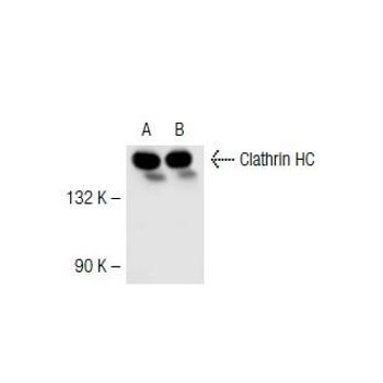 mouse monoclonal IgG1; Clathrin HC Antibody (TD.1) is an IgG1 κ mouse monoclonal Clathrin HC antibody (also designated Clathrin antibody, CLTC antibody, clathrin heavy chain antibody) that detects the Clathrin HC protein of broad species origin by WB, IP, IF and IHC(P). Clathrin HC Antibody (TD.1) is available as both the non-conjugated anti-Clathrin HC antibody form, as well as multiple conjugated forms of anti-Clathrin HC antibody, including agarose, HRP, PE, FITC and multiple Alexa Fluor® conjugates. Clathrin is a major cytosolic coat protein in pits and vesicles originating from the plasma membrane and the trans-Golgi network. In receptor-mediated endocytosis, receptor proteins are englufed by clathrin-coated vesicles. Clathrin is composed of three heavy chains and three light chains which associate non-covalently to form a triskelion structure. Clathrin heavy chain (HC) is composed of a terminal globular domain, a distal segment and a proximal segment containing a light chain binding site. The proximal segment of the Clathrin HC protein is essential for interactions between clathrin heavy chains and light chains which result in the formation of the triskelion structure.