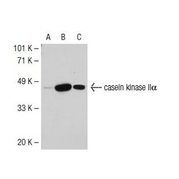 mouse monoclonal IgG1; casein kinase IIα Antibody (1AD9) is an IgG1 κ mouse monoclonal casein kinase IIα antibody (also designated casein kinase IIα antibody or casein kinase 2 alpha antibody) that detects casein kinase IIα of mouse, rat and human origin by WB, IP, IF and IHC(P). casein kinase IIα Antibody (1AD9) is available as the non-conjugated anti-casein kinase IIα antibody form, as well as multiple conjugated forms of anti-casein kinase IIα antibody, including agarose, HRP, PE, FITC and multiple Alexa Fluor® conjugates. Casein kinase I (also designated CKI) and casein kinase II (CKII) compose a family of serine/threonine protein kinases which are present in all eukaryotes examined to date. Casein kinase I family members, which include casein kinase Iα, Iγ, Iδ and Ie, have been implicated in the control of cytoplasmic and nuclear processes, including DNA replication and repair. Casein kinase II is usually expressed as a tetrameric complex consisting of either an α2β2 or an αα'β2 structure. The α catalytic subunit is stimulated by the β regulatory subunit, which undergoes autophosphorylation. Casein kinase II activity is high in the cytosol and nucleus of proliferating and differentiating cells. Casein kinase II is known to phosphorylate more than 100 different substrates including nuclear oncoproteins, transcription factors and enzymes involved in DNA metabolism.