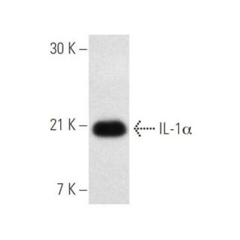 hamster monoclonal IgG; IL-1α Antibody (ALF-161) is an IgG Armenian hamster monoclonal IL-1 alpha antibody (also designated IL-1 alpha antibody, IL-1F1 antibody, Hematopoietin-1 antibody or Interleukin-1 alpha antibody) that detects the IL-1 alpha protein of mouse, rat and human origin by WB, IP, IF, FCM and ELISA. IL-1α Antibody (ALF-161) is available as both the non-conjugated anti-IL-1 alpha antibody form, as well as multiple conjugated forms of anti-IL-1 alpha antibody, including agarose, HRP, PE, FITC and multiple Alexa Fluor® conjugates. Two forms of interleukin-1, designated IL-1α and IL-1β, have been described. Although encoded by distinct genes and exhibiting roughly only 25% sequence identity, IL-1α and IL-1β bind to the same receptor and seem to elicit similar biological responses. IL-1 production is generally thought to be associated with inflammation, but it has also been shown to be expressed during kidney development, thymocyte differentiation and cartilage degradation. IL-1 plays a critical role in the regulation of immune response and inflammation, acting as an activator of T and B lymphocytes and natural killer (NK) cells. In T cells, IL-1 stimulates the production of IL-2 and selectively inhibits IL-4 expression. IL-1 induces B cell proliferation and maturation, and immunoglobulin synthesis. NK cells require IL-1β for production of the anti- pathogen IFN-γ. IL-1 has also been implicated in several pathological conditions including rheumatoid arthritis, inflammatory bowel disease and atherosclerosis.