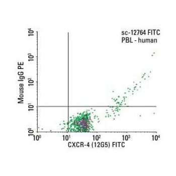 mouse monoclonal IgG2a; CXCR-4 Antibody (12G5) is an IgG2a κ mouse monoclonal CXCR-4 antibody that detects CXCR-4 of human origin by IP and FCM. CXCR-4 Antibody (12G5) is available as the non-conjugated anti-CXCR-4 antibody form, as well as multiple conjugated forms of anti-CXCR-4 antibody, including agarose, HRP, PE, FITC and multiple Alexa Fluor® conjugates. The C-X-C or a chemokine family is characterized by a pair of cysteine residues separated by a single amino acid and primarily functions as chemoattractants for neutrophils. The C-X-C family includes IL-8, NAP-2, MSGA and stromal cell derived factor-1 (SDF-1). SDF-1 was originally described as a pre-B cell stimulatory factor, but has now been shown to function as a potent chemo-attractant for T cells and monocytes but not neutrophils. Receptors for the C-X-C family are G protein-coupled, seven pass transmembrane domain proteins which include IL-8RA, IL-8RB and CXCR-4 (also known as LESTR or fusin). CXCR-4 is highly homologous to the IL-8 receptors, sharing 37% sequence identity at the amino acid level. The IL-8 receptors bind to IL-8, NAP-2 and MSGA, while fusin binds to its cognate ligand, SDF-1. CXCR-4 has been identified as the major co-receptor for T-tropic HIV-1 and SDF-1 has been shown to inhibit HIV-1 infection.