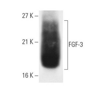 mouse monoclonal IgG2a; FGF-3 Antibody (MSD 1) is an IgG2a κ mouse monoclonal FGF-3 antibody (also designated FGF3 antibody) that detects the FGF-3 protein of mouse, rat and human origin by WB, IP, IF and IHC(P). FGF-3 Antibody (MSD 1) is available as both the non-conjugated anti-FGF-3 antibody form, as well as multiple conjugated forms of anti-FGF-3 antibody, including agarose, HRP, PE, FITC and multiple Alexa Fluor® conjugates. Fibroblast growth factor-1 (FGF-1), also designated acidic FGF, and fibroblast growth factor-2 (FGF-2), also designated basic FGF, are members of a family of growth factors that stimulate proliferation of cells of mesenchymal, epithe-lial and neuroectodermal origin.