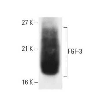 mouse monoclonal IgG2a; FGF-3 Antibody (MSD 1) is an IgG2a κ mouse monoclonal FGF-3 antibody (also designated FGF3 antibody) that detects the FGF-3 protein of mouse, rat and human origin by WB, IP, IF and IHC(P). FGF-3 Antibody (MSD 1) is available as both the non-conjugated anti-FGF-3 antibody form, as well as multiple conjugated forms of anti-FGF-3 antibody, including agarose, HRP, PE, FITC and multiple Alexa Fluor® conjugates. Fibroblast growth factor-1 (FGF-1), also designated acidic FGF, and fibroblast growth factor-2 (FGF-2), also designated basic FGF, are members of a family of growth factors that stimulate proliferation of cells of mesenchymal, epithe-lial and neuroectodermal origin.