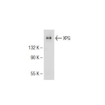 mouse monoclonal IgG2a; XPG Antibody (8H7) is an IgG2a κ mouse monoclonal XPG antibody (also designated XPG antibody) that detects the XPG protein of human origin by WB, IP, IF and IHC(P). XPG Antibody (8H7) is available as both the non-conjugated anti-XPG antibody form, as well as multiple conjugated forms of anti-XPG antibody, including agarose, HRP, PE, FITC and multiple Alexa Fluor® conjugates. Seven complementation groups (A-G) of xeroderma pigmentosum have been described. The xeroderma pigmentosum group A protein, XPA, is a zinc metalloprotein which preferentially binds to DNA damaged by ultraviolet (UV) radiation and chemical carcinogens. XPA is a DNA repair enzyme that has been shown to be required for the incision step of nucleotide excision repair. XPG (also designated ERCC5) is an endonuclease that makes the 3′ incision in DNA nucleotide excision repair. Mammalian XPG is similar in sequence to yeast RAD2. Conserved residues in the catalytic center of XPG are important for nuclease activity and function in nucleotide excision repair.