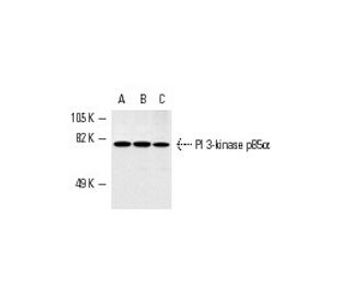 mouse monoclonal IgG1; PI 3-kinase p85α Antibody (B-9) is an IgG1 κ mouse monoclonal PI 3-kinase p85 alpha antibody (also designated PI3K antibody, p85 alpha antibody, PIK3R1 antibody or phosphoinositide-3-kinase regulatory subunit 1 antibody) that detects the PI 3-kinase p85 alpha protein of mouse, rat and human origin by WB, IP, IF and IHC(P). PI 3-kinase p85α Antibody (B-9) is available as both the non-conjugated anti-PI 3-kinase p85 alpha antibody, and multiple Alexa Fluor® conjugates. Phosphatidylinositol 3-kinase (PI 3-kinase) is composed of p85 and p110 subunits. p85 lacks PI 3-kinase activity and acts as an adapter, coupling p110 to activated protein tyrosine kinase. Two forms of p85 have been described (p85α and p85β), each possessing one SH3 and two SH2 domains. Various p110 isoforms have been identified. p110α and p110β interact with p85α, and p110α has also been shown to interact with p85β in vitro. p110δ expression is restricted to white blood cells. It has been shown to bind p85α and β, but it apparently does not phosphorylate these subunits. p110δ seems to have the capacity to autophosphorylate. p110γ does not interact with the p85 subunits. It has been shown to be activated by α and βγ heterotrimeric G proteins.