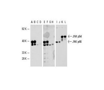 mouse monoclonal IgG1; JNK1 Antibody (F-3) is an IgG1 κ mouse monoclonal JNK1 antibody (also designated MAPK8 antibody or SAPK1 antibody) that detects the JNK1 protein of mouse, rat and human origin by WB, IP, IF and IHC(P). JNK1 Antibody (F-3) is available as both the non-conjugated anti-JNK1 antibody form, as well as multiple conjugated forms of anti-JNK1 antibody, including agarose, FITC and multiple Alexa Fluor® conjugates. c-Jun N-terminal kinases (JNKs) phosphorylate and augment transcriptional activity of c-Jun. JNKs originate from three genes that yield 10 isoforms through alternative mRNA splicing, including JNK1a1,JNK1b1, JNK2a1, JNK2b1, and JNK3a1, which represent the p46 isoforms, and JNK1a2, JNK1b2, JNK2a2, JNK2b2, and JNK3b2, which represent the p54 isoforms.JNKs coordinate cell responses to stress and influence regulation of cell growth and transformation. The human JNK1 (PRKM8, SAPK1, MAPK8) gene maps to chromosome 10q11.22 and shares 83% amino acid identity with JNK2. JNK1 is necessary for normal activation and differentiation of CD4 helper T (TH) cells into TH1 and TH2 effector cells. Capsaicin activates JNK1 and p38 in ras-transformed human breast epithelial cells. Nitrogen oxides (NOx) upregulate JNK1 in addition to c-Fos, c-Jun, and other signaling kinases, including MEKK1 and p38.