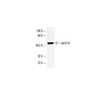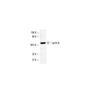 mouse monoclonal IgE; cyclin A Antibody (BF683) is an IgE mouse monoclonal cyclin A antibody that detects cyclin A of mouse, rat and human origin by WB, IP, IF, FCM, KA and ELISA. cyclin A Antibody (BF683) is available as both conjugated and non-conjugated anti-cyclin A antibody forms. The critical role that the family of regulatory proteins known as cyclins play in eukaryotic cell cycle regulation is well established. The best-characterized cyclin complex is the mitotic cyclin B/Cdc2 p34 kinase, the active component of maturing promoting factor. Cyclin A accumulates prior to cyclin B in the cell cycle, appears to be involved in control of S phase and has been shown to associate with cyclin- dependent kinase-2 (Cdk2). In addition, cyclin A has been implicated in cell transformation and is found in complexes with E1A, transcription factors DRTF1 and E2F and retinoblastoma protein, p110. A second form of cyclin A, named cyclin A1 because of its high sequence homology to Xenopus cyclin A1, is most highly expressed in germ cells. It has been proposed that cyclin A1 can associate with Cdk2, p39 and Cdc2 p34.