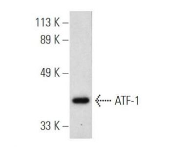 mouse monoclonal IgG1; Eukaryotic gene transcription is regulated by sequence-specific transcription factors that bind modular cis acting promoter and enhancer elements. The ATF/ CREB transcription factor family binds the palindromic cAMP response element (CRE) octanucleotide TGACGTCA. The ATF/CREB family includes CREB-1, CREB-2 (also designated ATF-4), ATF-1, ATF-2 and ATF-3. This family of proteins contain highly divergent N-terminal domains, but share a C-terminal leucine zipper for dimerization and DNA binding. ATF-1 is shown to play a key role in the induction of NOX1. ATF-1 binds the cAMP response element (CRE) and mediates PKA-induced stimulation of CRE-reporter genes. ATF-2 forms homodimers and heterodimers with c-Jun to initiate CRE-dependent transcription. Phosphorylation of ATF-2 at Thr 69 and Thr 71 by stress-activated kinases is necessary for transcriptional activation. Myc also induces phosphorylation of ATF-2 at Thr 69 and Thr 71 to prolong the half-life of ATF-2. ATF-2 functions as a histone acetyltransferase (HAT) and acetylates Histones H2B and H4 specifically in vitro.