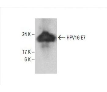 mouse monoclonal IgG2a; HPV16 E7 Antibody (TVG710Y) is an IgG2a κ mouse monoclonal HPV16 E7 antibody that detects E7 of HPV-16 origin by WB, IP and IF. HPV16 E7 Antibody (TVG710Y) is available as the non-conjugated anti-HPV16 E7 antibody form, as well as multiple conjugated forms of anti-HPV16 E7 antibody, including agarose, HRP, PE, FITC and multiple Alexa Fluor® conjugates. The HPV E7 proteins are small zinc-binding phosphoproteins that are localized in the nucleus. They are structurally and functionally similar to the E1A protein of subgenus C adenoviruses. The CR2 homology region contains the LXCXE motif (residues 22-26) involved in binding to the tumor suppressor protein pRb. This sequence is also present in SV40 and polyoma large T antigens. The high risk HPV E7 proteins (e.g. HPV16 E7 and HPV18 E7) have an approximately ten-fold higher affinity for pRb protein than the low risk HPV E7 proteins (e.g. HPV6 E7). Association of the E7 protein with pRb promotes cell proliferation by the same mechanism as the E1A proteins of adenoviruses and SV40 large T antigen. Research has shown that E7 promotes degradation of Rb family proteins rather than simply inhibiting their function by complex formation. The CR2 region also contains the casein kinase II phosphorylation site (residues 31 and 32). HPV16 and 18 are strongly associated with cervical, vaginal and vulvar malignancies.