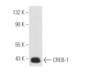 mouse monoclonal IgG2b; CREB-1 Antibody (24H4B) is an IgG2b κ mouse monoclonal CREB-1 antibody (also designated CREB-1 antibody or CREB antibody) that detects CREB-1A and CREB-1B of mouse, rat and human origin by WB, IP and IF. CREB-1 Antibody (24H4B) is available as the non-conjugated anti-CREB-1 antibody form, as well as multiple conjugated forms of anti-CREB-1 antibody, including agarose, HRP, PE, FITC and multiple Alexa Fluor® conjugates. Eukaryotic gene transcription is regulated by sequence-specific transcription factors that bind modular cis-acting promoter and enhancer elements. The ATF/CREB transcription factor family binds the palindromic cAMP response element (CRE) octanucleotide TGACGTCA. The ATF/CREB family includes CREB-1, CREB-2 (also designated ATF-4), ATF-1, ATF-2 and ATF-3. This family of proteins contains highly divergent N-terminal domains, but shares a C-terminal leucine zipper for dimerization and DNA binding. Although CREB can bind to DNA in an unphosphorylated state, it cannot activate transcription. Phosphorylation of CREB on Ser 133 by protein kinase A facilitates its interaction with the CREB-binding protein (CBP) and activates the basal transcription complex. CREB functions in neoglucogenesis through interactions with the nuclear coactivator PGC-1. CREB may play a role in the pathogenesis of type II diabetes and dilated cardiomyopathy.