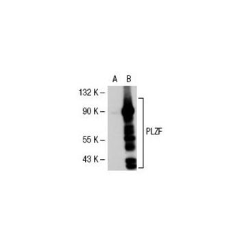 mouse monoclonal IgG1; PLZF Antibody (D-9) is an IgG1 κ mouse monoclonal PLZF antibody (also designated ZBTB16 antibody, or ZNF145 antibody) that detects the PLZF protein of mouse, rat and human origin by WB, IP, IF, IHC(P) and ELISA. PLZF Antibody (D-9) is available as both the non-conjugated anti-PLZF antibody form, as well as multiple conjugated forms of anti-PLZF antibody, including agarose, HRP, PE, FITC and multiple Alexa Fluor® conjugates. Hypermethylated in cancer (HIC-1) was originally identified as a target of p53-induced gene expression. HIC-1 is deleted in the genetic disorder Miller-Dieker syndrome (MDS). The expression of HIC-1 is also frequently suppressed in leu-kemia and other various cancers due to the hypermethylation of specific DNA regions and the resulting transcriptional silencing. These and other studies indicate that HIC-1 acts as a putative tumor suppressor protein that mediates transcriptional repression. HIC-1 is ubiquitously expressed in adult tissues and its structure is defined by five zinc fingers and an N-terminal broad-complex POZ (or BTB) domain. The BTB/POZ domain mediates homomeric and heteromeric POZ-POZ interactions and is common to transcriptional regulators involved in chromatin modeling. In several BTB/POZ containing proteins, including BCL-6 and the promyelocytic leukemia zinc finger (PLZF) oncoprotein, this domain interacts with the SMRT/N-CoR-mSin3A HDAC complex and is directly involved in repressing and silencing gene transcription. When this domain is deleted, as with the oncogenic PLZF-RAR chimera of promyelocytic leukemias, this transcriptional repression is attenuated. Conversely, HIC-1 does not interact with components of the HDAC complex, suggesting that HIC-1-induced transcriptional repression is unassociated with the POZ/BTB domain.