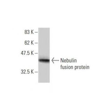 mouse monoclonal IgG1; Nebulin Antibody (1F4) is an IgG1 κ mouse monoclonal Nebulin antibody (also designated Nebulin antibody) that detects the Nebulin protein of human origin by WB, IP and ELISA. Nebulin Antibody (1F4) is available as the non-conjugated anti-Nebulin antibody. Caldesmon, filamin 1, nebulin and villin are differentially expressed and regulated actin binding proteins. Both muscular (CDh) and non-muscular (CDl) forms of caldesmon have been identified and each has been shown to bind to actin as well as to calmodulin and myosin. CDh is expressed predominantly on thin filaments in smooth muscle, whereas CDl is widely expressed in non-muscle tissues and cells. Filamin 1, which is ubiquitously expressed and exists as a homodimer, functions to crosslink actin to filaments. Nebulin is a large filamentous protein specific to muscle tissue that may function as a ruler for filament length. Several isoforms of nebulin are produced by alternative exon usage. Villin is Ca ++-regulated and is the major structural component of the brush border of absorptive cells.
