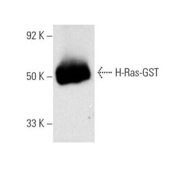rat monoclonal IgG2a; The mammalian Ras (also designated v-Ha-Ras, Harvey rat sarcoma viral oncogene homolog, HRAS1, K-Ras, N-Ras, RASH1 or c-bas/has) gene family consists of the Harvey and Kirsten Ras genes (c-H-Ras1 and c-K-Ras2), an inactive pseudogene of each (c-H-Ras2 and c-K-Ras1) and the N-Ras gene. The three Ras oncogenes, H-Ras, K-Ras and N-Ras, encode proteins with GTP/GDP binding and GTPase activity. Ras proteins alternate between an inactive form bound to GDP and an active form bound to GTP, activated by a guanine nucleotide-exchange factor (GEF) and inactivated by a GTPase-activating protein (GAP). Ras nomenclature originates from the characterization of human DNA sequences homologous to cloned DNA fragments containing oncogenic sequences of a type C mammalian retrovirus, the Harvey strain of murine sarcoma virus (HaMSV), derived from the rat. Under normal conditions, Ras family members influence cell growth and differentiation events in a subcellular membrane compartmentalization-based signaling system. Oncogenic Ras can deregulate processes that control both cell proliferation and apoptosis. The Ras superfamily of GTP hydrolysis-coupled signal transduction relay proteins can be subclassified into Ras, Rho, Rab and ARF families.
