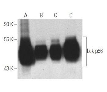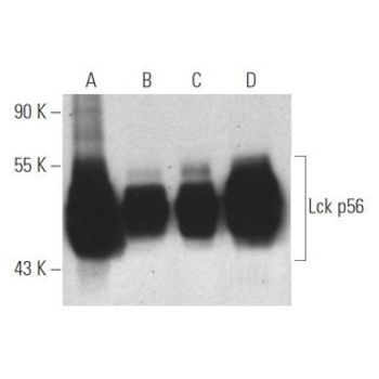 mouse monoclonal IgG2b; Lck Antibody (3A5) is an IgG2b κ mouse monoclonal Lck antibody (also designated p56LCK antibody, LCK proto-oncogene antibody, Src family tyrosine kinase Lck antibody) that detects the Lck protein of mouse, rat and human origin by WB, IP, IF, IHC(P) and FCM. Lck Antibody (3A5) is available as both the non-conjugated anti-Lck antibody form, as well as multiple conjugated forms of anti-Lck antibody, including agarose, HRP, PE, FITC and multiple Alexa Fluor® conjugates. Src is the human homolog of the v-Src gene of the Rous sarcoma virus, also known as avian sarcoma virus, or ASV. Src was the first proto-oncogenic, non-receptor tyrosine kinase characterized in human. By virtue of common structural motifs, the Src family is composed of nine members in vertebrates, including Src, Yes, Fgr, Frk, Fyn, Lyn, Hck, Lck and Blk. Src family kinases transduce signals that are involved in the control of a variety of cellular processes, including proliferation, differentiation, motility and adhesion. Src family kinases contain an amino terminal cell membrane anchor, followed by an SH3 domain and an SH2 domain that are involved in modular association and activation, respectively. Src family kinases are normally maintained in an inactive state and can be activated transiently during cellular events such as mitosis. Different subcellular localizations of Src family kinases may be important for the regulation of specific cellular processes, such as mitogenesis, cytoskeletal organization and membrane trafficking. The Fyn and Lck Src family tyrosine kinases play a key role in T cell antigen receptor (TCR) signaling. The human Lck gene maps to chromosome 1p35.1 and encodes a 509 amino acid protein.