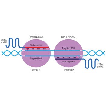 Double Nickase Plasmids consist of a pair of plasmids each encoding a D10A mutated Cas9 nuclease and a target-specific 20 nt guide RNA (gRNA) designed to knockout gene expression with greater specificity than its CRISPR/Cas9 KO counterpart