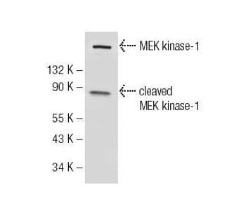 mouse monoclonal IgG1; MEK kinase-1 Antibody (1-9C-2A) is an IgG1 κ mouse monoclonal MEK kinase-1 antibody (also designated M3K1 antibody, Mitogen-Activated Protein Kinase Kinase Kinase 1 antibody, MAPKKK1 antibody, MEKK1 antibody, MEKK antibody, MAPK/ERK Kinase Kinase 1 antibody, or MAP/ERK Kinase Kinase 1 antibody) that detects the MEK kinase-1 protein of mouse, rat and human origin by WB, IP and IF. MEK kinase-1 Antibody (1-9C-2A) is available as both the non-conjugated anti-MEK kinase-1 antibody form, as well as multiple conjugated forms of anti-MEK kinase-1 antibody, including agarose, HRP, PE, FITC and multiple Alexa Fluor® conjugates. Mitogen-activated protein (MAP) kinase cascades are activated by various extracellular stimuli including growth factors. The MEK kinases (also designated MAP kinase kinase kinases, MKKKs, MAP3Ks or MEKKs) phosphorylate and thereby activate the MEKs (also called MAP kinase kinases or MKKs), including ERK, JNK and p38. These activated MEKs in turn phosphorylate and activate the MAP kinases. The MEK kinases include Raf-1, Raf-B, Mos, MEK kinase-1, MEK kinase-2, MEK kinase-3, MEK kinase-4, ASK 1 (MEK kinase-5) and MAP3K6 (MEK kinase-6). MEK kinase-1 activates the ERK and c-Jun NH(2)-terminal kinase (JNK) pathways by phosphorylation of MAP2K1 and MAP2K4, and also activates the central protein kinases of the NFκB pathway, CHUK and IKBKB. Additionally, MEK kinase-1 uses an E3 ligase through its PHD domain, a RING-finger-like structure, to target proteins for degradation through ubiquitination.