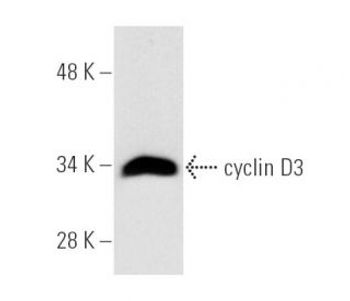 rat monoclonal IgG2a; cyclin D3 Antibody (18B6-10) is an IgG2a rat monoclonal cyclin D3 antibody that detects cyclin D3 p34 of mouse, rat and human origin by WB, IP, IF, IHC(P) and ELISA. cyclin D3 Antibody (18B6-10) is available as the non-conjugated anti-cyclin D3 antibody form, as well as multiple conjugated forms of anti-cyclin D3 antibody, including agarose, HRP, PE, FITC and multiple Alexa Fluor® conjugates. The proliferation of eukaryotic cells is controlled at specific points in the cell cycle, particularly at the G1 to S and the G2 to M transitions. It is well established that the Cdc2 p34-cyclin B protein kinase plays a critical role in the G2 to M transition while cyclin A associates with Cdk2 p33 and functions in S phase. Considerable effort directed towards the identification of G1 cyclins has led to the isolation of cyclin D, cyclin C and cyclin. Of these, cyclin D corresponds to a putative human oncogene, designated PRAD1, which maps at the site of the Bcl-1 rearrangement in certain lymphomas and leukemias. Two additional human type D cyclins, as well as their mouse homologs, have been identified. Evidence has established that members of the cyclin D family function to regulate phosphorylation of the retinoblastoma gene product, thereby activating E2F transcription factors.