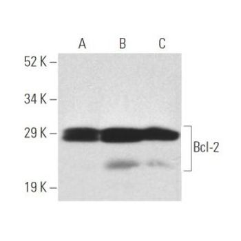 mouse monoclonal IgG1; Bcl-2 Antibody (100) is an IgG1 κ mouse monoclonal Bcl-2 antibody that detects Bcl-2 of human origin by WB, IP, IF, IHC(P) and FCM. Bcl-2 Antibody (100) is available as the non-conjugated anti-Bcl-2 antibody form, as well as multiple conjugated forms of anti-Bcl-2 antibody, including agarose, HRP, PE, FITC and multiple Alexa Fluor® conjugates. Bcl-2 is one among many key regulators of apoptosis, which are essential for proper development, tissue homeostasis, and protection against foreign pathogens. Human Bcl-2 is an anti-apoptotic, membrane-associated oncoprotein that can promote cell survival through protein-protein interactions with other Bcl-2 related family members, such as the death suppressors Bcl-xL, Mcl-1, Bcl-w, and A1 or the death agonists Bax, Bak, Bik, Bad, and Bid. The anti-apoptotic function of Bcl-2 can also be regulated through proteolytic processing and phospho-rylation. Bcl-2 may promote cell survival by interfering with the activation of the cytochrome c/Apaf-1 pathway through stabilization of the mitochondrial membrane. Mutations in the Bcl-2 gene can contribute to cancers where normal physiological cell death mechanisms are compromised by deregulation of the anti-apoptotic influence of Bcl-2.