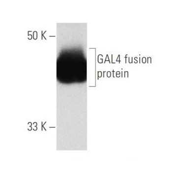 mouse monoclonal IgG2a; GAL4 Antibody (DBD) is an IgG2a κ mouse monoclonal GAL4 antibody (also designated GAL4 DNA binding domain antibody, GAL4 DBD Upstream Activation Sequence system antibody, GAL4 UAS system antibody, or yeast GAL4 DBD antibody) that detects the GAL4 protein. GAL4 Antibody (DBD) is available as both the non-conjugated anti-GAL4 antibody form, as well as multiple conjugated forms of anti-GAL4 antibody, including agarose, HRP, PE, FITC and multiple Alexa Fluor® conjugates. The GAL4 protein of Saccharomyces cerevisiae is one of the most thoroughly characterized transcriptional activators. Since the N-terminal 147 amino acid residues of GAL4 are sufficient to mediate specific and strong binding to DNA, but are incapable of efficient transcriptional activation, this protein fragment has frequently been used to confer specific DNA binding in experiments examining transcriptional activation functions of heterologous proteins. This approach is facilitated by the finding that higher eukaryotes lack endogenous proteins that enhance transcription from the consensus GAL4-binding site. Fusions between GAL4 (aa 1-147) and activating domains from a variety of transcriptional regulatory proteins can activate transcription in yeast, plant, insects and mammalian cells. A unique "two-hybrid" system has been developed using GAL4 fusions in yeast to identify specific protein-protein interactions.