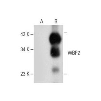 mouse monoclonal IgG1; WBP2 Antibody (D-12) is an IgG1 λ mouse monoclonal WBP2 antibody (also designated WBP2 antibody) that detects the WBP2 protein of mouse, rat and human origin by WB, IP, IF and ELISA. WBP2 Antibody (D-12) is available as both the non-conjugated anti-WBP2 antibody form, as well as multiple conjugated forms of anti-WBP2 antibody, including agarose, HRP, PE, FITC and multiple Alexa Fluor® conjugates. WW domain-binding protein 2 (WBP2) is a 261 amino acid protein expressed in most tissues. The WW domain is composed of 38 to 40 semi-conserved amino acids and is shared by various groups of proteins, including structural, regulatory and signaling proteins. The domain mediates protein-protein interactions through the binding of polyproline ligands. WBP2 binds to the WW domain of Yes-associated protein (YAP), WW domain containing E3 ubiquitin protein ligase 1 (AIP5) and WW domain containing E3 ubiquitin protein ligase 2 (AIP2). The gene encoding WBP2 is located on human chromosome 17, which comprises over 2.5% of the human genome and encodes over 1,200 genes, some of which are involved in tumor suppression and in the pathogenesis of Li-Fraumeni syndrome, early onset breast cancer and a predisposition to cancers of the ovary, colon, prostate gland and fallopian tubes.