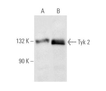 mouse monoclonal IgG1; Tyk 2 Antibody (C-8) is an IgG1 κ mouse monoclonal Tyk 2 antibody (also designated TYK2 antibody, Janus kinase (JAK) family protein tyrosine kinase antibody, JTK1 antibody, cytoplasmic type I / type II cytokine receptor interacting protein antibody, type I / type III interferon signaling pathway component antibody, or immune response / antiviral activity related protein antibody) that detects the Tyk 2 protein of mouse, rat and human origin by WB, IP, IF, IHC(P) and ELISA. Tyk 2 Antibody (C-8) is available as both the non-conjugated anti-Tyk 2 antibody form, as well as multiple conjugated forms of anti-Tyk 2 antibody, including agarose, HRP, PE, FITC and multiple Alexa Fluor® conjugates. Tyk 2 belongs to the family of non-receptor janus tyrosine kinases, which regulate a spectrum of cellular functions occurring downstream of activated cytokine receptors in the lympho-hematopoietic system. Immunological stimuli, such as interferons and cytokines, recruit STAT transcription factors to the cytokine receptor where Tyk 2 is associated. Tyk 2 then phosphorylates proximal STAT factors, which subsequently dimerize, translocate to the nucleus, and bind to cis elements upstream of target gene promoters to regulating transcription. The canonical JAK-STAT pathway is integral to maintaining a normal immune system by stimulating proliferation, differentiation, survival, and host resistance to pathogens. Cytokine induced pro-inflammatory responses are attractive targets for anti-inflammatory therapies, specifically at the level of Jak-STAT signaling.
