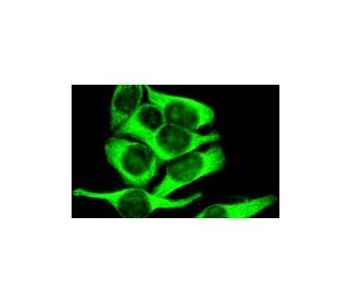 mouse monoclonal IgG2a; α Tubulin Antibody (B-7) is an IgG2a κ mouse monoclonal α Tubulin antibody that detects α Tubulin of mouse, rat and human origin by WB, IP, IF, IHC(P), FCM and ELISA. α Tubulin Antibody (B-7) is available as the non-conjugated anti-α Tubulin antibody form, as well as multiple conjugated forms of anti-α Tubulin antibody, including agarose, HRP, PE, FITC and multiple Alexa Fluor® conjugates. Tubulin is a major cytoskeleton component that has five distinct forms, designated α, β, γ, δ and e Tubulin. α and β Tubulins form heterodimers which multimerize to form a microtubule filament. Multiple β Tubulin isoforms (β1, β2, β3, β4, β5, β6 and β8) have been characterized and are expressed in mammalian tissues. β1 and β4 are present throughout the cytosol, β2 is present in the nuclei and nucleoplasm, and β3 is a neuron-specific cytoskeletal protein. γ Tubulin forms the gammasome, which is required for nucleating microtubule filaments at the centrosome. Both δ Tubulin and e Tubulin are associated with the centrosome. δ Tubulin is a homolog of the Chlamydomonas δ Tubulin Uni3 and is found in association with the centrioles, whereas e Tubulin localizes to the pericentriolar material. e Tubulin exhibits a cell-cycle-specific pattern of localization, first associating with only the older of the centrosomes in a newly duplicated pair and later associating with both centrosomes.