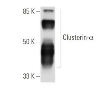 mouse monoclonal IgG1; Clusterin-α Antibody (B-5) is an IgG1 κ mouse monoclonal Clusterin-alpha antibody (also designated CLU antibody, KUB1 antibody, APOJ antibody and Apolipoprotein J antibody) that detects the Clusterin-alpha protein of human origin by WB, IP, IF, IHC(P) and ELISA. Clusterin-α Antibody (B-5) is available as both the non-conjugated anti-Clusterin-alpha antibody form, as well as multiple conjugated forms of anti-Clusterin-alpha antibody, including agarose, HRP, PE, FITC and multiple Alexa Fluor® conjugates. Clusterin, also designated complement lysis inhibitor (CLI), apolipoprotein J (ApoJ), sulfated glycoprotein 2 (SGP2), SP-40 and testosterone-repressed prostate message 2 (TRPM2), is a secretory, heterodimeric glycoprotein that influences immune regulation, cell adhesion, transformation, lipid transportation, tissue remodeling, membrane recycling and cell-cell interactions. Clusterin is synthesized as a 449 amino acid polypeptide that is post-translationally cleaved at an internal bond between Arg 227 and Ser 228. Two subunits, α and β, are associated through disulfide bonds. The β subunit (also called ApoJα) corresponds to residues 23-227. The α subunit (also called ApoJβ) corresponds to residues 228-449. Overexpression of Clusterin appears to be more common in late stages of mammary tumor progression. Clusterin markedly influences β-Amyloid structure and neuritic toxicity in vivo and may influence Alzheimer's disease pathogenesis.