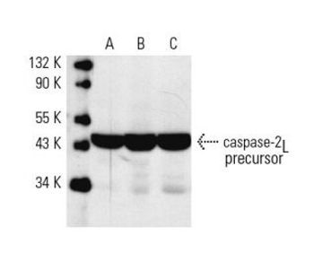 mouse monoclonal IgG1; caspase-2L Antibody (F-7) is an IgG1 κ mouse monoclonal caspase-2L antibody that detects p13 subunit, caspase-2L and full length caspase-2 precursor of mouse, rat and human origin by WB, IP, IF and ELISA. caspase-2L Antibody (F-7) is available as the non-conjugated anti-caspase-2L antibody form, as well as multiple conjugated forms of anti-caspase-2L antibody, including agarose, HRP, PE, FITC and multiple Alexa Fluor® conjugates. Caspase-2 (Nedd2, Ich-1) is an aspartate-specific cysteine protease that is activated in response to various apoptotic stimuli. Caspase-2 is unique among the caspases in that it has features of both upstream caspases (long prodomain) and downstream caspases (DEXD substrate specificity). Caspase-2 is highly expressed in the brain during development, and is expressed at low levels in adult tissue. Specifically, caspase-2 localizes to the mitochondria, the Golgi, the cytoplasm, and the nucleus. Caspase-2 exists as two isoforms, caspase-2L and caspase-2S, which are produced by alternative splicing and differ in their N and C-termini. Caspase-2L acts as a positive regulator of apoptosis, whereas caspase-2S functions as a negative regulator of apoptosis. Following apoptotic stimuli, the caspase-2L precursor undergoes cleavage at Asp 153 to produce a fragment p30. The p30 fragment undergoes further cleavage to generate a fragment containing amino acids 153-308 (p18) and a fragment containing amino acids 317-435 (p13 or p14). As apoptosis progresses, the p13 (p14) fragment can undergo further processing to yield a fragment containing amino acids 331-435 (p12).