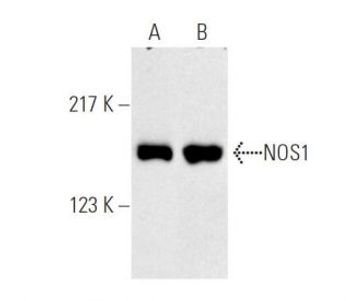 mouse monoclonal IgG1; NOS1 Antibody (A-11) is an IgG1 κ mouse monoclonal NOS1 antibody (also designated bNOS antibody or nNos antibody) that detects the NOS1 protein of mouse, rat and human origin by WB, IP, IF and ELISA. NOS1 Antibody (A-11) is available as both the non-conjugated anti-NOS1 antibody form, as well as multiple conjugated forms of anti-NOS1 antibody, including agarose, HRP, PE, FITC and multiple Alexa Fluor® conjugates. Nitric oxide (NO) has a broad range of biological activities and has been implicated in signaling pathways in phylogenetically diverse species. Nitric oxide synthases (NOSs), the enzymes responsible for synthesis of NO, contain an N-terminal oxygenase domain and a C-terminal reductase domain. NOS activity requires homodimerization as well as three cosubstrates (L-arginine, NADPH and O2) and five cofactors or prosthetic groups (FAD, FMN, calmodulin, tetrahydrobiopterin and heme). Several distinct NOS isoforms have been described and been shown to represent the products of three distinct genes. These include two constitutive Ca2+/CaM-dependent forms of NOS, including NOS1 (also designated ncNOS) whose activity was first identified in neurons, and NOS3 (also designated ecNOS), first identified in endothelial cells. The inducible form of NOS, NOS2 (also designated iNOS), is Ca2+-independent and is expressed in a broad range of cell types.