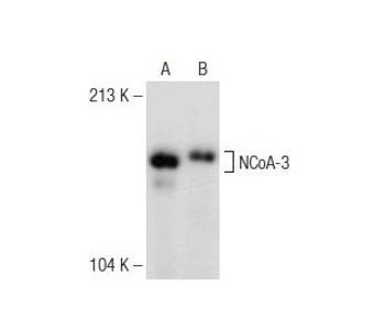 mouse monoclonal IgG1; NCoA-3 Antibody (F-2) is an IgG1 κ mouse monoclonal NCoA-3 antibody (also designated Nuclear Receptor Coactivator 3 antibody, Thyroid Hormone Receptor Activator Molecule 1 antibody, Receptor-Associated Coactivator 3 antibody, BHLHe42 antibody, TRAM-1 antibody, SRC-3 antibody, ACTR antibody, AIB1 antibody, RAC3 antibody, Class E Basic Helix-Loop-Helix Protein 42 antibody, Steroid Receptor Coactivator Protein 3 antibody, Amplified In Breast Cancer 1 Protein antibody, CBP-Interacting Protein antibody, KAT13B antibody, TNRC16 antibody, AIB-1 antibody, SRC3 antibody, PCIP antibody, BHLHE42 antibody, TNRC14 antibody, CTG26 antibody, P/CIP antibody, TRAM1 antibody, or RAC-3 antibody) that detects the NCoA-3 protein of mouse, rat and human origin by WB, IP, IF and ELISA. NCoA-3 Antibody (F-2) is available as both the non-conjugated anti-NCoA-3 antibody form, as well as multiple conjugated forms of anti-NCoA-3 antibody, including agarose, HRP, PE, FITC and multiple Alexa Fluor® conjugates. Nuclear receptors for steroids, thyroid hormones and retinoic acids are ligand-dependent transcription factors that activate transcription through specific DNA binding sites in their target genes. Several related transcriptional coactivators and corepressors have been described that work in concert with the steroid receptor family to either induce or repress transcription from hormone-responsive elements. This family includes GRIP1 (for GR interacting protein 1), also designated NCoA-2 or TIF-2; SRC-1 (for steroid receptor coactivator-1), also designated NCoA-1; and NCoA-3, also designated RAC3, ACTR, AIB-1 (for amplified in breast cancer) and p/CIP (for p300/CBP/co-integrator protein), which displays elevated expression in estrogen receptor positive ovarian and breast cancers and is required for the transcriptional activation of p300/CBP-dependent transcription factors.