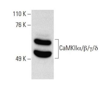 mouse monoclonal IgG1; CaMKIIα/β/γ/δ Antibody (G-1) is an IgG1 κ mouse monoclonal CaMKIIα/β/γ/δ antibody (also designated CAMK2A antibody or calcium/calmodulin dependent protein kinase II alpha/beta/gamma/delta antibody) that detects the CaMKIIα/β/γ/δ protein of mouse, rat and human origin by WB, IP, IF, IHC(P) and ELISA. CaMKIIα/β/γ/δ Antibody (G-1) is available as both the non-conjugated anti-CaMKIIα/β/γ/δ antibody form, as well as multiple conjugated forms of anti-CaMKIIα/β/γ/δ antibody, including agarose, HRP, PE, FITC and multiple Alexa Fluor® conjugates. The Ca2+/calmodulin-dependent protein kinases (CaM kinases) comprise a structurally related subfamily of serine/threonine kinases which include CaMKI, CaMKII and CaMKIV. CaMKII is a ubiquitously expressed serine/threonine protein kinase that is activated by Ca2+ and calmodulin (CaM) and has been implicated in regulation of the cell cycle and transcription. There are four CaMKII isozymes designated α, β, γ and δ, which may or may not be co-expressed in the same tissue type. CaMKIV is stimulated by Ca2+ and CaM but also requires phosphorylation by a CaMK for full activation. Stimulation of the T cell receptor CD3 signaling complex with an anti-CD3 monoclonal antibody leads to a 10-40 fold increase in CaMKIV activity. An additional kinase, CaMKK, functions to activate CaMKI through the specific phosphorylation of the regulatory Threonine residue at position 177.