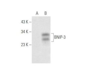 mouse monoclonal IgG2b; BNIP-3 Antibody (ANa40) is an IgG2b κ mouse monoclonal BNIP-3 antibody (also designated BNIP3 antibody, or NIP3 antibody) that detects the BNIP-3 protein of mouse, rat and human origin by WB, IP and IF. BNIP-3 Antibody (ANa40) is available as both the non-conjugated anti-BNIP-3 antibody form, as well as multiple conjugated forms of anti-BNIP-3 antibody, including agarose, HRP, PE, FITC and multiple Alexa Fluor® conjugates. The adenovirus E1B protein is a viral homolog of the Bcl-2 family of proteins that are involved in regulating cell death. A family of interacting proteins, which are designated Nip or Bnip and include BNIP-1, BNIP-2, BNIP-3 and Nix, associate with both the E1B protein and Bcl-2 proteins to mediate apoptotic signaling. BNIP-1 contains a hydrophobic transmembrane domain, which enables its localization to the nuclear envelope, endoplasmic recticulum and mitochondria. BNIP-2, (previously designated Nip2 and Nip21 in human and mouse respectively), shares homology with the non-catalytic domain of Cdc42 GTPase-activating protein (Cdc42GAP). Through binding to Cdc42GAP, BNIP-2 enhances the GTPase activity of Cdc42GAP, facilitating the hydrolysis of GTP bound to Cdc42 and thereby, mediating the signaling pathways involving receptor kinases, small GTPases and apoptotic proteins. Nix, which is also designated Nip3L or Bnip3L, is highly related to BNIP-3, and both proteins localize to the mitochondria where they associate with Bcl-2 proteins. BNIP-3 preferentially binds to Bcl-xL and induces apoptosis by suppressing the anti-apoptosis activity of Bcl-xL.