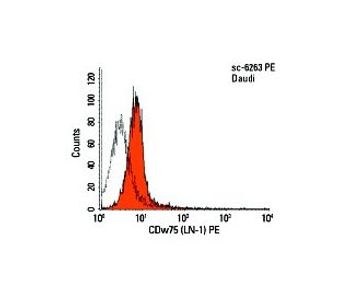 mouse monoclonal IgM; CDw75/ST6GAL1 Antibody (LN-1) is an IgM mouse monoclonal CDw75/ST6GAL1 antibody (also designated CDw75 antibody) that detects the ST6GAL1 protein of mouse, rat and human origin by WB, IP, IF, IHC(P) and FCM. CDw75/ST6GAL1 Antibody (LN-1) is available as both the non-conjugated anti-CDw75/ST6GAL1 antibody form, as well as multiple conjugated forms of anti-CDw75/ST6GAL1 antibody, including PE, FITC. Modification of cell surface glycoprotein and glycolipid oligosaccharides is thought to play a role in tumorigenesis and metastasis. Sialyltransferases catalyze the incorporation of sialic acid into the carbohydrate chains present on glycoproteins and function in intracellular terminal glycosylation pathways. The expression of one such sialyltransferase, CD75, (also known as ST6GAL1), leads to the appearance of the cell surface antigens CD76, HB-6 and CDw75. Expressed in the golgi apparatus and secreted into the extracellular fluid, ST6GAL1 is a type II membrane protein that is involved in generating sialylated antigens that function as cell-surface carbohydrate determinants. One such antigen, CDw75 (also known as CD75s or CD75-sialyated), is formed via the catalytic transfer of a sialic acid residue from CD75 to a cell surface galactose-containing carbohydrate acceptor. While CD75 functions in cells throughout the body, CDw75 is found primarily on B and T cells and may be upregulated in B-cell leukemias, suggesting a possible role for CDw75 in carcinogenesis.
