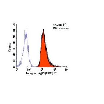 mouse monoclonal IgG1; Integrin αV/β3/CD51/CD61 Antibody (23C6) is an IgG1 κ mouse monoclonal Integrin αV/β3 antibody that detects Integrin αV/β3 of mouse, rat and human origin by IP, IF, IHC(P) and FCM. Integrin αV/β3/CD51/CD61 Antibody (23C6) is available as both conjugated and non-conjugated anti-Integrin αV/β3 antibody forms. Integrins are heterodimers composed of noncovalently associated transmembrane a and b subunits. The 16 a and 8 b subunits heterodimerize to produce more than 20 different receptors. Most integrin receptors bind ligands that are components of the extracellular matrix, including Fibronectin, Collagen and Vitronectin. Certain integrins can also bind to soluble ligands such as Fibrinogen, or to counterreceptors on adjacent cells such as the intracellular adhesion molecules (ICAMs), leading to aggregation of cells. Ligands serve to cross-link or cluster integrins by binding to adjacent integrin receptors; both receptor clustering and ligand occupancy are necessary for the activation of integrin-mediated responses. In addition to mediating cell adhesion and cytoskeletal organization, integrins function as signaling receptors. Signals transduced by integrins play a role in many biological processes, including cell growth, differentiation, migration and apoptosis.