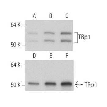 mouse monoclonal IgG1; TRα1/β1 Antibody (C4) is an IgG1 κ mouse monoclonal TR alpha 1/ beta 1 antibody (also designated THRA antibody, THRB antibody, THA antibody, THB antibody antibody, Thyroid Hormone Receptor Alpha antibody, NR1A1 antibody, Nuclear Receptor Subfamily 1 Group A Member 1 antibody, V-ErbA-Related Protein 7 antibody, ERBA1 antibody, THRA1 antibody, THRA2 antibody, EAR-7 antibody, EAR7 antibody, ERBA antibody, ERBA-Related 7 antibody, C-ERBA-1 antibody, or Thyroid Hormone Receptor Beta antibody) that detects the TR alpha 1/ beta 1 protein of human origin by WB, IP and IF. TRα1/β1 Antibody (C4) is available as both the non-conjugated anti-TR alpha 1/ beta 1 antibody form, as well as multiple conjugated forms of anti-TR alpha 1/ beta 1 antibody, including agarose, HRP, PE, FITC and multiple Alexa Fluor® conjugates. Thyroid hormone nuclear receptors (TRs) are ligand-dependent transcription factors which regulate and control many metabolic and developmental processes. There are two genes encoding TRs identified to date, TRα and TRβ. TRs bind to thyroid hormone response elements (TREs) with half-site binding motifs in the orientation of palindromes, direct repeats or inverted palindromes. The affinities of binding are both variable and influenced differentially by 3,5,3′-triiodo-L-thyronine (T3). Transcriptional regulation by TRs is also modulated by heterodimerization with TR nuclear accessory proteins, the most extensively characterized of which are the retinoid X receptors (RXRα, RXRβ and RXRγ). The TRα isoform, TRα1, can display both a nuclear and undefined cytoplasmic location, and is the only TR that is imported into the mitochondrial matrix. The TRβ isoform TRβ1 forms a complex with the PI 3-kinase p85α subunit and plays an important role in the T3-induced activation of Akt in pancreatic β cells.